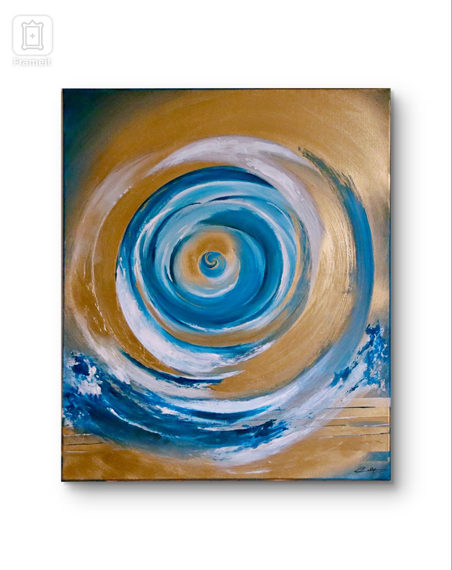 Ce tableau d'art abstrait est composé en spirale , avec pour couleurs dominante du blanc titane, du bleu canard, du turquoise et du doré.