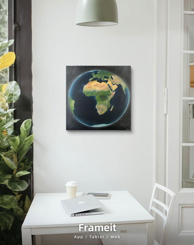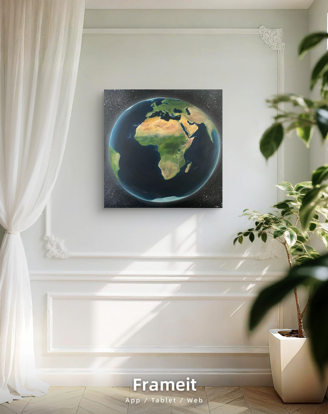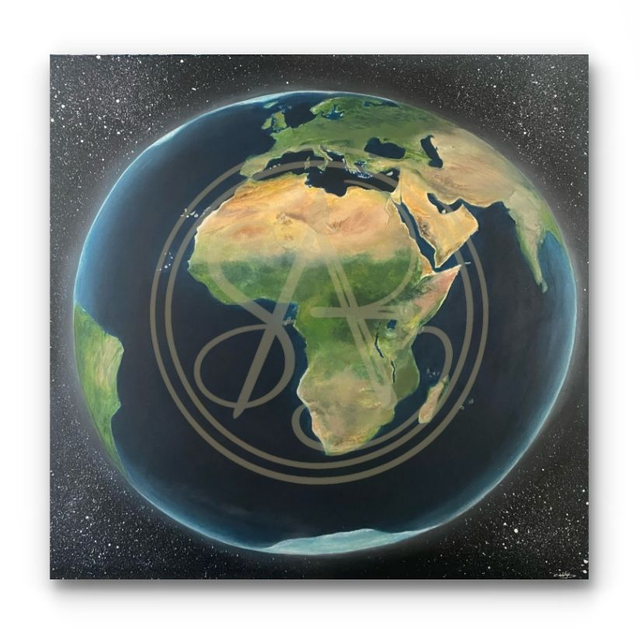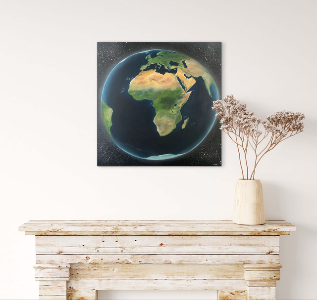 Ce tableau est une représentation réaliste et animée de notre belle planète, centrée sur le continent africain. Depuis l'espace, un halo de lumineux révèle l'impression de la Terre en mouvement et accentue la perception ovale de sa forme sphérique. Enfin, un jeu de lumière est plus éclairée côté Nord Atlantique (Marco, Sénégal, Îles..) puis bascule progressivement vers l'ombre à partir du Sud-Est (Afrique du Sud, Madagascar).