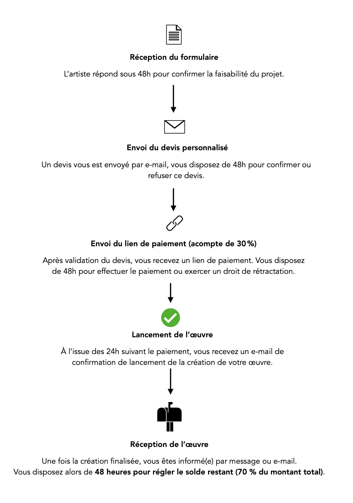 - Sous 48h, l’artiste confirme la faisabilité picturale et vous envoie un devis personnalisé. Vous recevez un lien pour régler l’acompte (30 %). La création débute dès réception.
